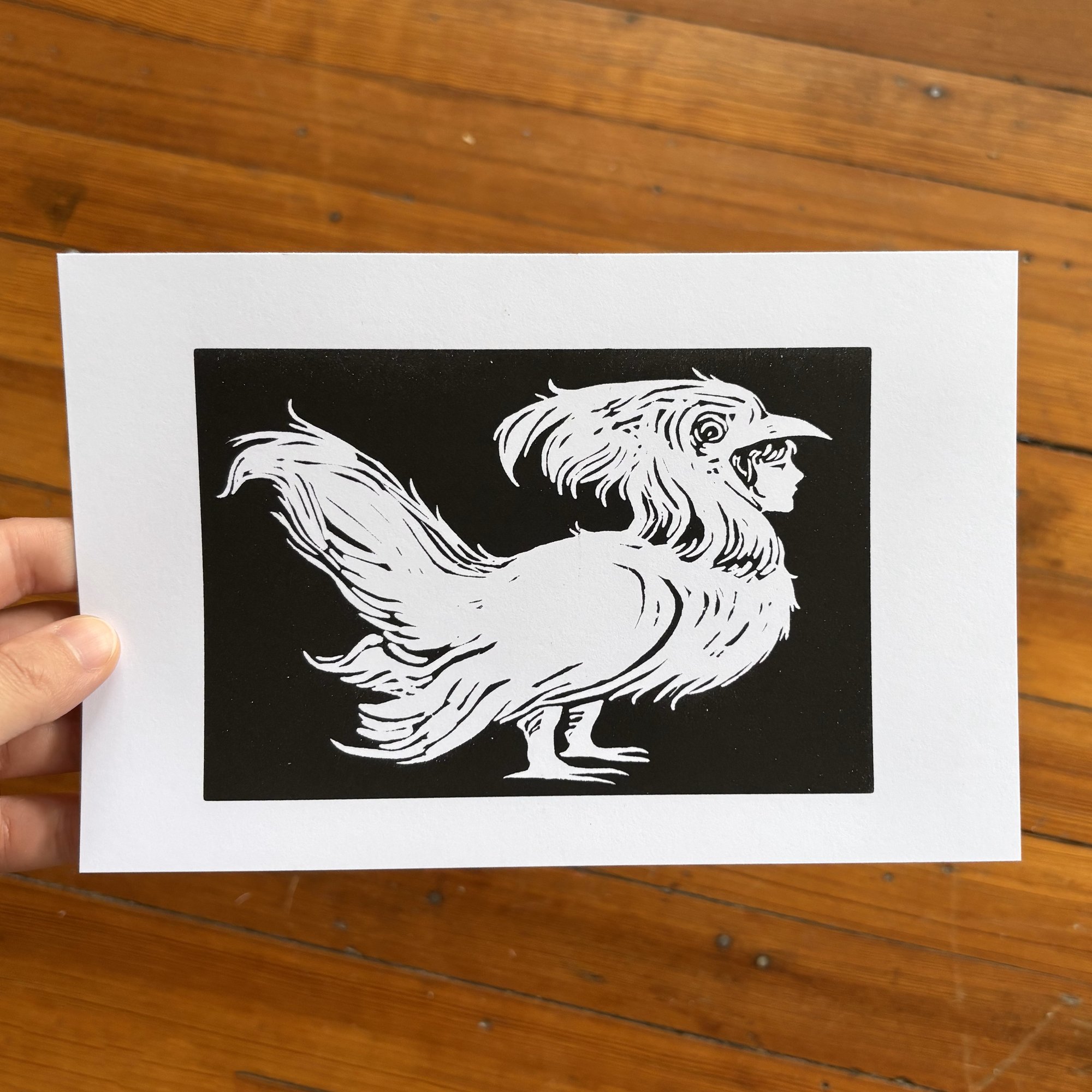 a risograph print of a linoleum carved print i did in the past! inspired by an antique postcard in my personal collection